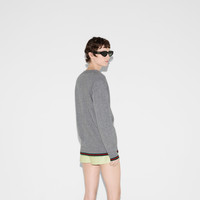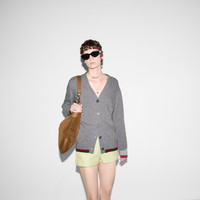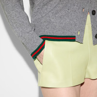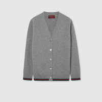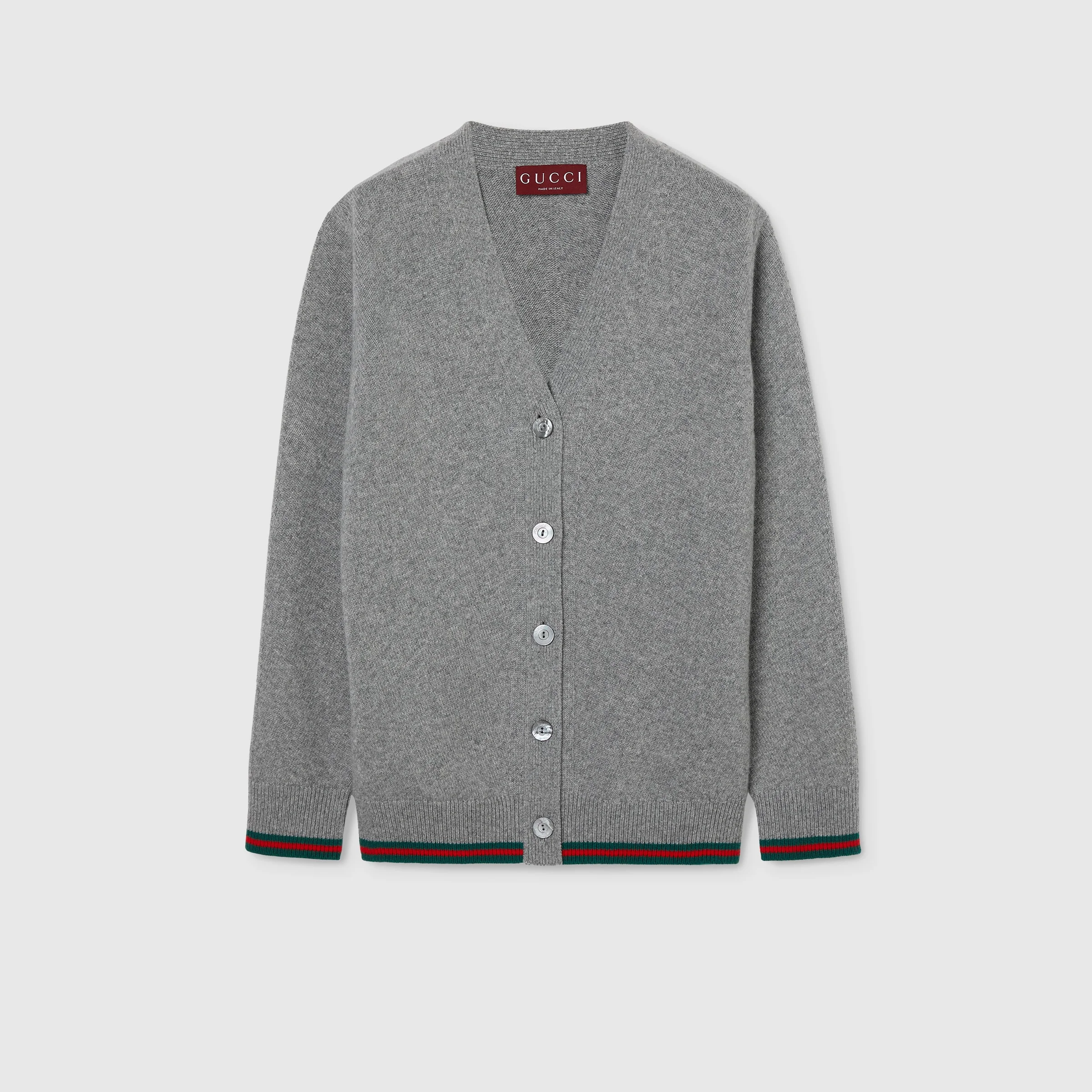 Gucci's House codes continue to evolve for the new season across relaxed jersey pieces. Crafted from a wool and cashmere fabric, this V-neck cardigan is defined by a green and red Web trim across the cuffs and hem. - Grey melange wool and cashmere - V-neck - Dropped shoulder - Long sleeves - Web trim - Button closure - Length: 26.3"; based on a size S - Made in Italy - The product shown in this image is a size small