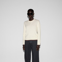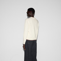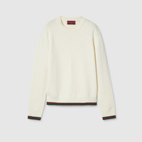 Gucci's House codes continue to evolve for the new season across relaxed jersey pieces. Crafted from a wool and cashmere fabric, this crewneck sweater is defined by a green and red Web trim across the cuffs and hem. - Ivory wool and cashmere - Crewneck - Dropped shoulder - Long sleeves - Web trim - Length: 23.2"; based on a size S - Made in Italy - The model is 5'9" and is wearing size small