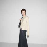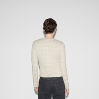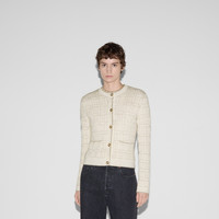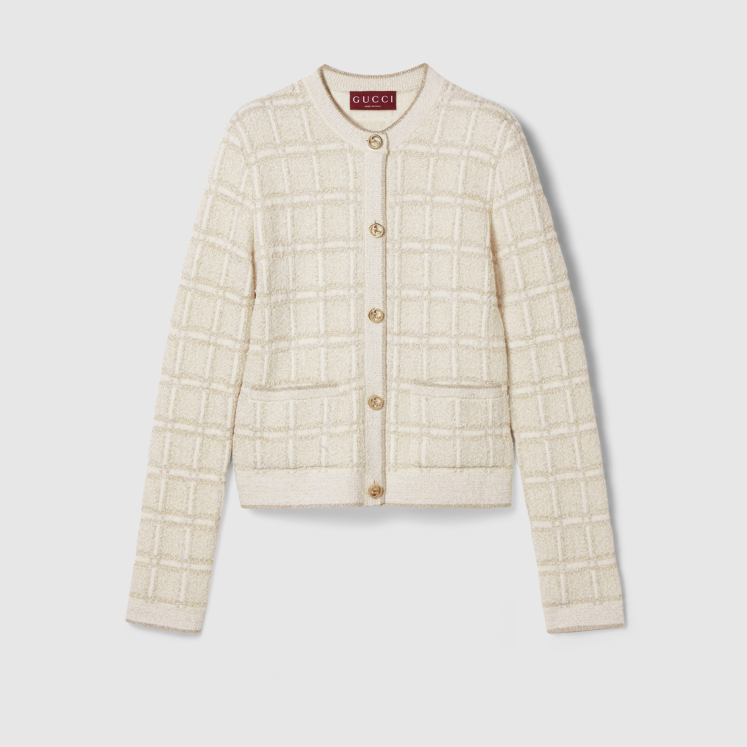 A selection of ready to wear pieces are decorated with shimmering and sparkling details, adding an unexpected twist to signature House styles. This crewneck cardigan has been crafted from a wool and lame check jacquard and completed with Round Interlocking G buttons. - White and gold wool and lame check jacquard - Round Interlocking G buttons - Crewneck - Dropped shoulder - Long sleeves - Two front pockets - Rib trim - Button closure - Length: 21.6"; based on a size S - Made in Italy - The product shown in this image is a size small