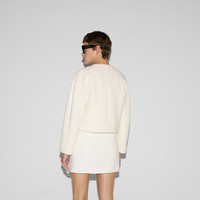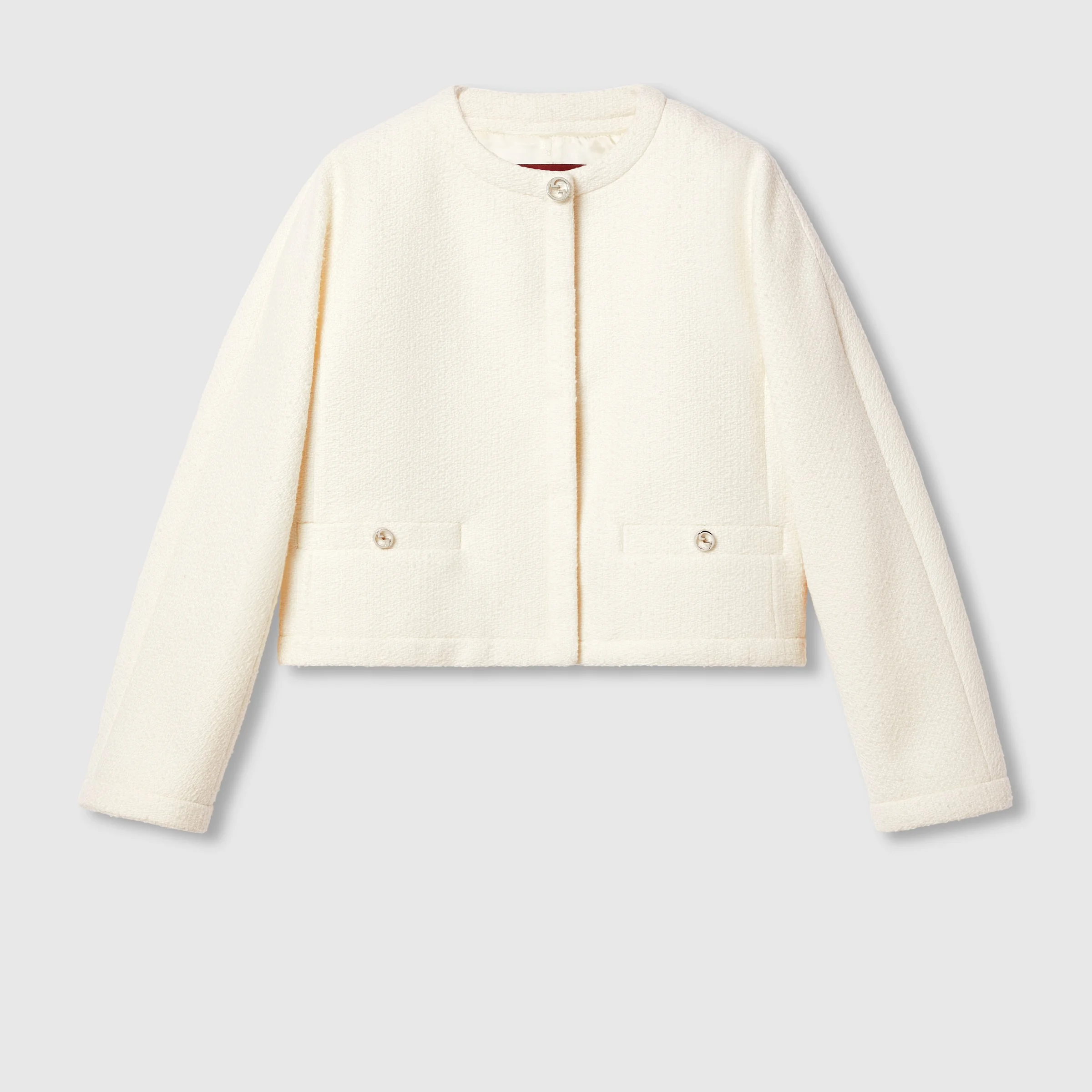 The Gucci Cruise 2025 collection features minimalist garments in either total white or total black, introducing finely constructed pieces in an essential palette. This collarless jacket is presented in wool boucle and enriched with silver-toned Round Interlocking G hardware. - Off white wool boucle - Round Interlocking G buttons - Lined - Collarless - Two front pockets - Button closure - Length: 19.6"; based on a size 40 (IT) - Made in Italy - The model is 5'7" and is wearing size 40 (IT)