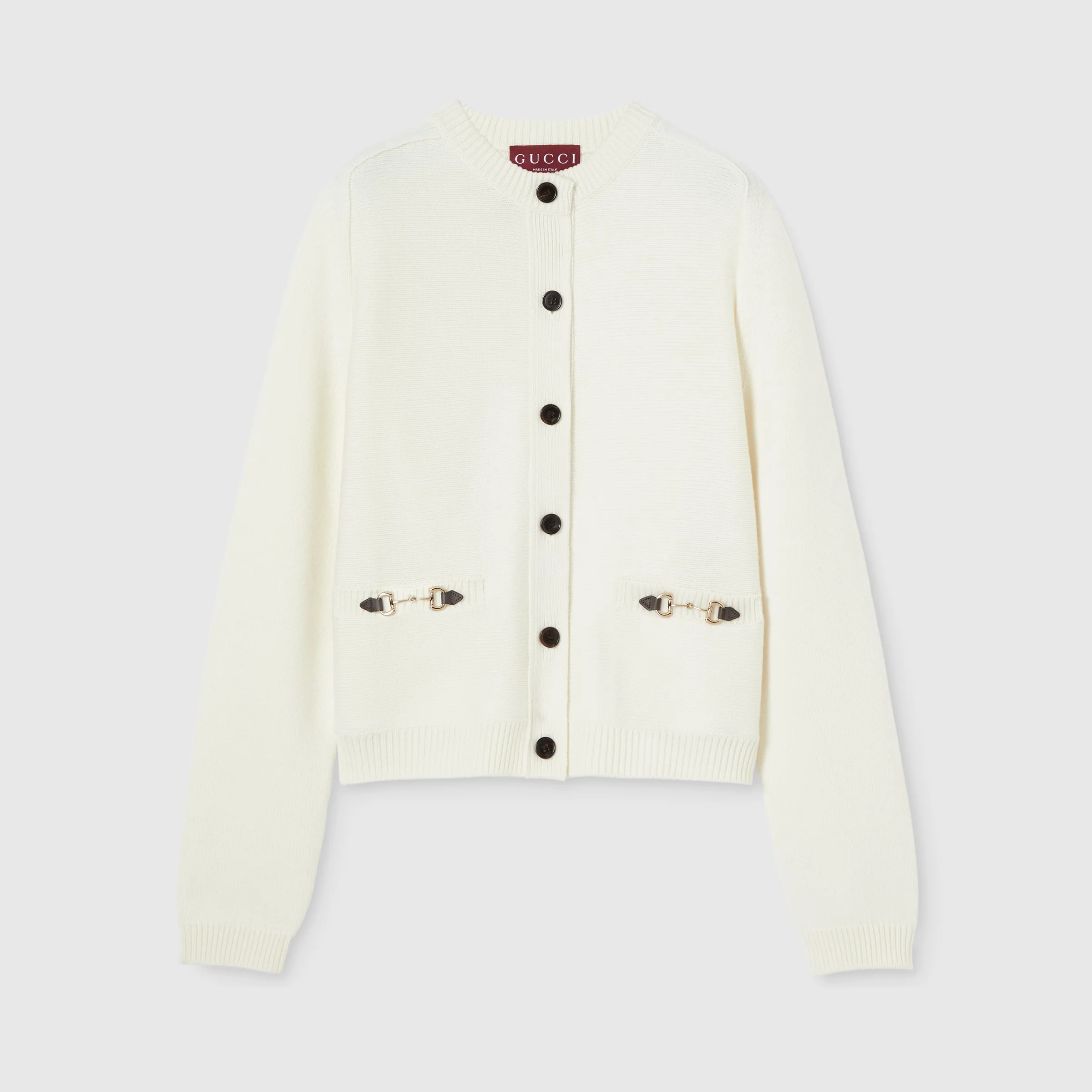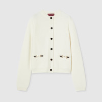 The statement cardigan jacket is a key silhouette of the season. It can be worn on top of a contrasting color, or paired with a mini skirt for harmonious proportions. Crafted from wool cashmere, this cardigan is enriched with an Horsebit detail. - White wool cashmere - Horsebit with leather detail - Crewneck - Rib trim - Front pockets - Long sleeves - Front button closure - Length: 26.5" based on a size S