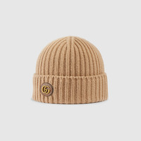 Delicate color palettes and archival codes define a selection of soft accessories. Presented in camel, this hat is crafted with a rib knit wool cashmere. An oval Double G leather patch decorates the accessory, adding a soft logo touch to the design. - Camel rib knit wool cashmere - Gold-toned hardware - Oval Double G leather patch - Made in Italy