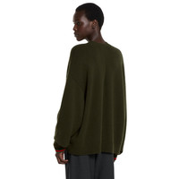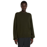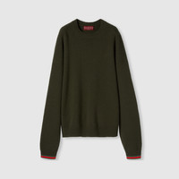 Green defines the color narrative for Pre-Fall 2025 and speaks volume with textures, logo details and varying tonalities, as seen on the runway. This dropped shoulder sweater appears in a wool cashmere blend, complete with a Web trim. - Dark green wool and cashmere - Crewneck - Dropped shoulder - Web trim on cuffs - Rib trim - Length: 24.8"; based on a size S - Made in Italy - Fabric: 70% Wool, 30% Cashmere - Trimming: 85% Wool, 15% Cashmere