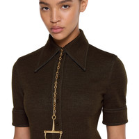 In the Fall Winter 2025 collection, this short-sleeved shirt is designed with a long point collar. The design is embellished with Gucci and Interlocking G embroideries and completed by a front button closure. - Dark brown double wool cotton jersey - Gucci embroidery - Interlocking G embroidery - Long point collar - Short sleeves - Button closure - Length: 21.7"; based on a size 38 (IT) - Made in Italy