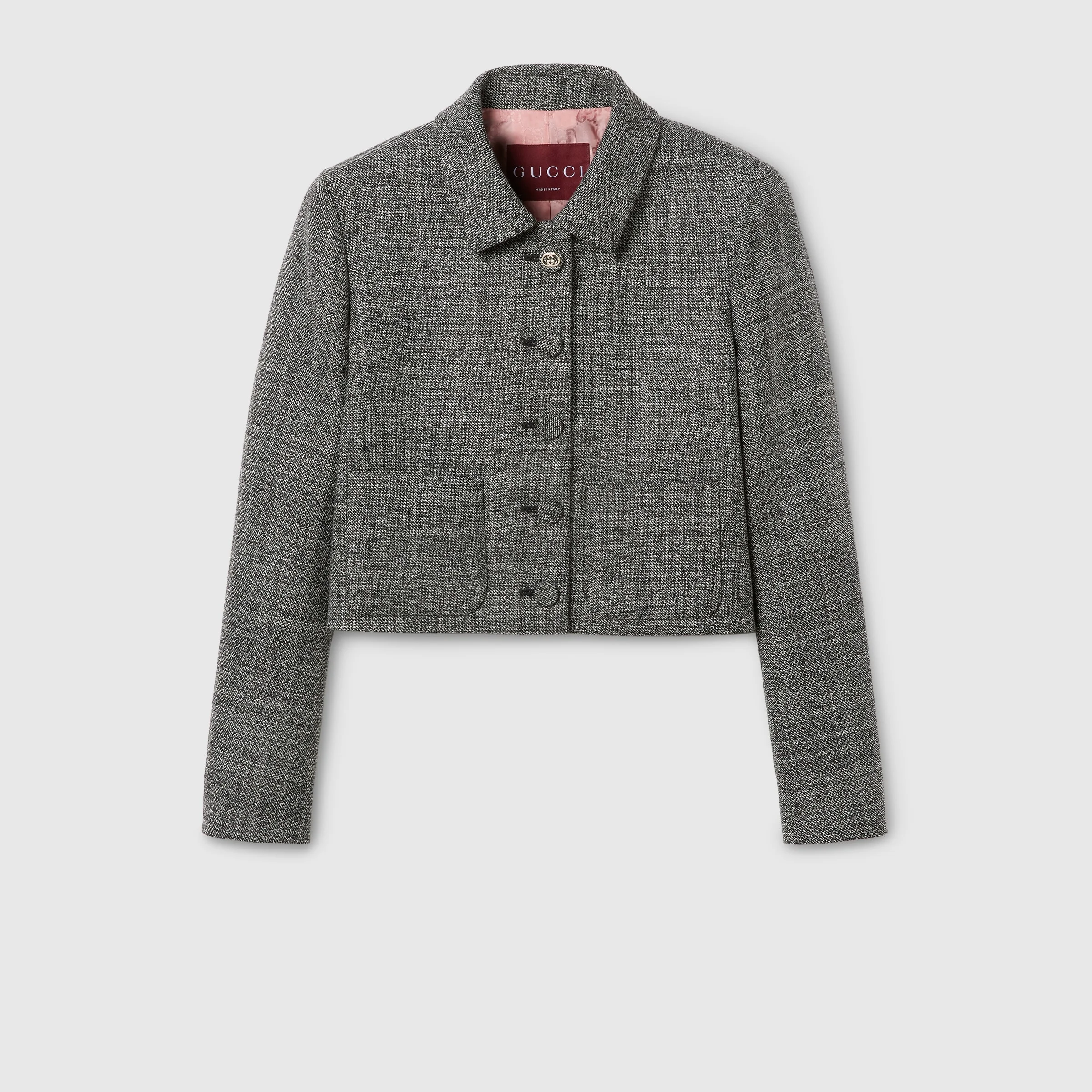 The collection blends archival inspirations with 1990s opulence. Silhouettes with a strong, structured shoulder are combined with fitted pieces from day to night. Tailored in black and white wool grisaille, this jacket is finished with a signature Interlocking G button. - Black and white wool grisaille - Interlocking G button - Lined - Point collar - Front pockets - Front button closure - Length: 16.9"