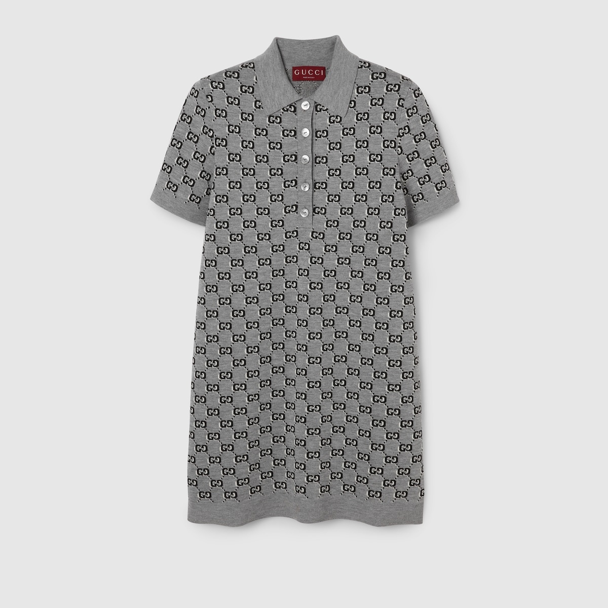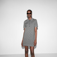 This piece is part of the Pre-Fall 2024 collection, presenting a modern take on sophisticated materials. The extrafine wool GG jacquard with optical effect adds textural and visual interest to this polo dress with a regular fit, in a refined palette of grey, black and white. - Grey and multicolor extrafine wool jacquard with GG Shadow - Polo collar - Short sleeves - Rib trim - Side slit pockets - Shoulder drop: 14.1 " based on a size S (IT) - Sleeves Length: 8.85 " based on a size S (IT) - Button closure - Cut for a regular fit - Length: 15.9 " based on a size S (IT) - Made in Italy - The product shown in this image is a size small (IT)