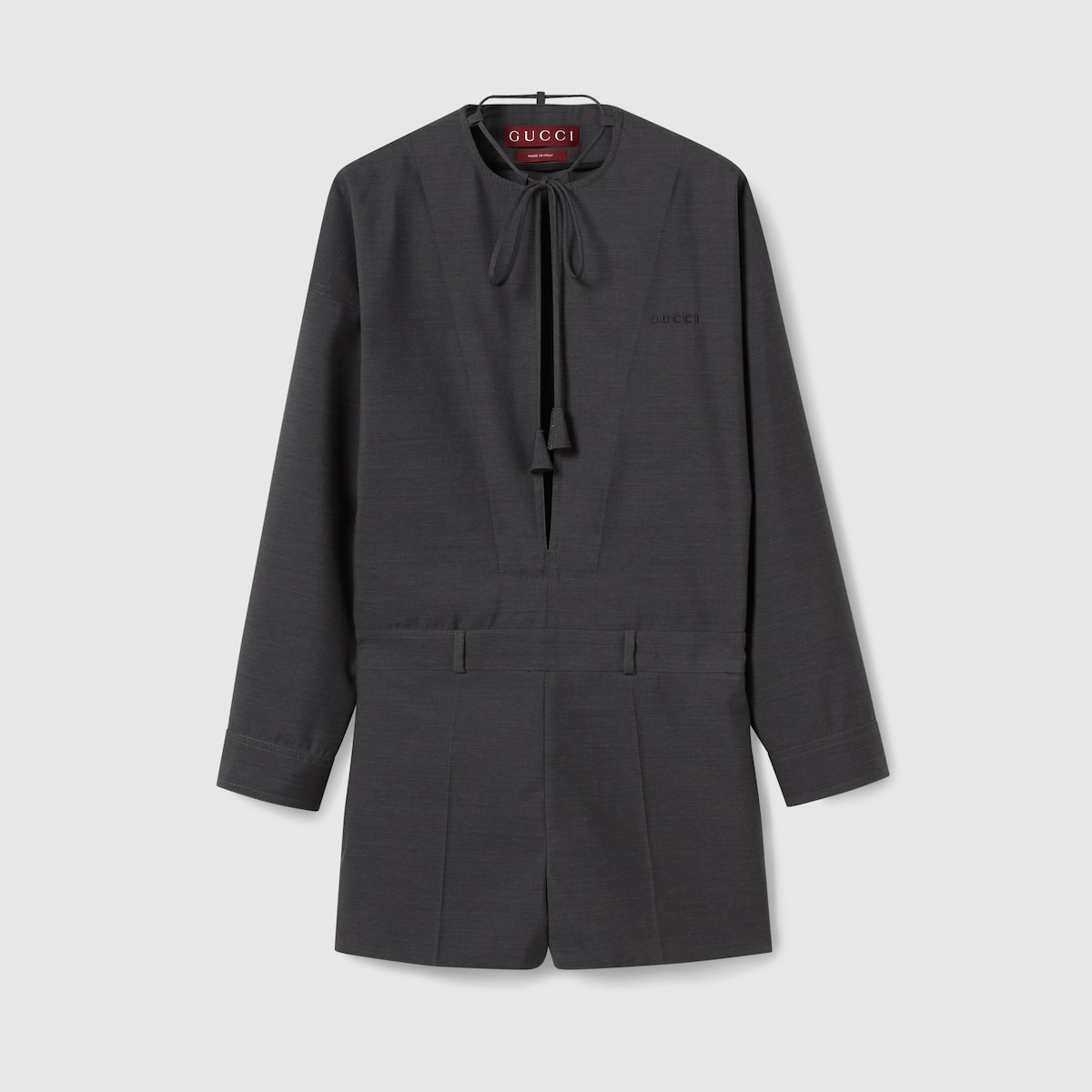 In the Spring Summer 2025 collection, unexpected tailoring is introduced through precise silhouettes. This jumpsuit has a deep V neckline, with ties for styling. - Grey lightweight wool - Gucci embroidery detail - Unlined - Deep V, self-tie neckline - Dropped shoulder - Long sleeves - Belt loops - Two back pockets - Zip closure - Length: 30.7" based on a size 38 (IT) - Made in Italy - The product shown in the image is a size 38 (IT)