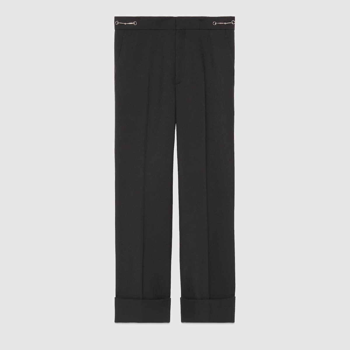 The Cruise 2024 collection features a wide range of pant suits in houndstooth, Prince of Wales, and classic menswear patterns. Worn separately or as an ensemble, blazers, pants, and skirts form an essential part of the transitional season wardrobe. Crafted from black wool, these sleek trousers feature a slim Horsebit detail on the front. - Black wool - Unlined - Slim Horsebit detail - Internal tape belt - Two front slash pockets - Two back besom pockets - Turn-up hem - Length: 37" based on a size 38 (IT) - Leg opening: 10.4" based on a size 38 (IT) - Made in Italy - The product shown in this image is a size 38 (IT)