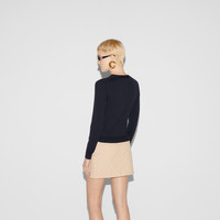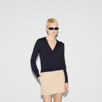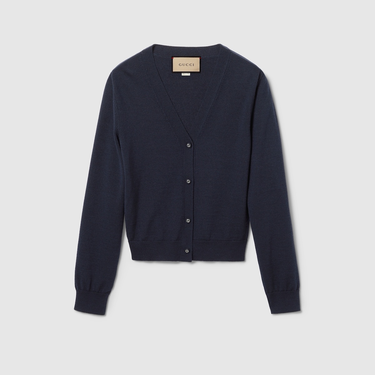 Garden-inspired palette, floral prints, and sophisticated lightweight materials are a prelude to the warmer weather. This streamlined cardigan is crafted from a delicate wool silk blend and completed with Interlocking G self-covered buttons for an elevated finish. - Navy wool silk - Interlocking G self-covered buttons - V-neck - Long sleeves - Rib trim - Button closure - Length: 20", based on a size small - Made in Italy - The product shown in the image is a size small