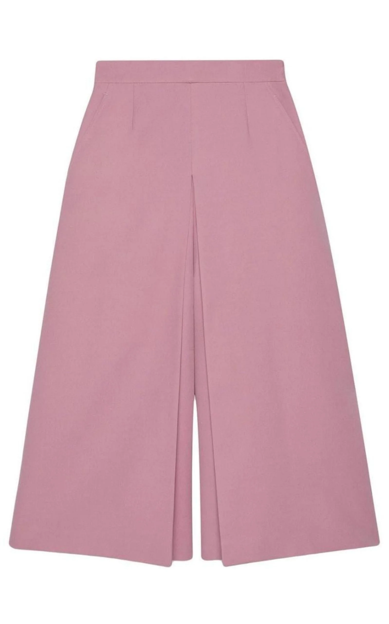 Imbued with a vintage inspiration, the culotte pant is designed with a high waist and wide leg, presented in peony pink cady wool silk crêpe. Pastels push the color focus throughout the Pre-Fall 2020 collection, in soft, vibrant hues. - Peony pink cady wool silk crêpe - Self-covered buttons - Front slash pockets - Back button-through besom pockets - Side zip closure - Sits high on the waist; wide leg with calf length - Leg opening: 30.5" based on a size 40 (IT) - 54% silk and 46% wool - Made in Italy - The model is 5'7". The product this image is a size 40 (IT)
