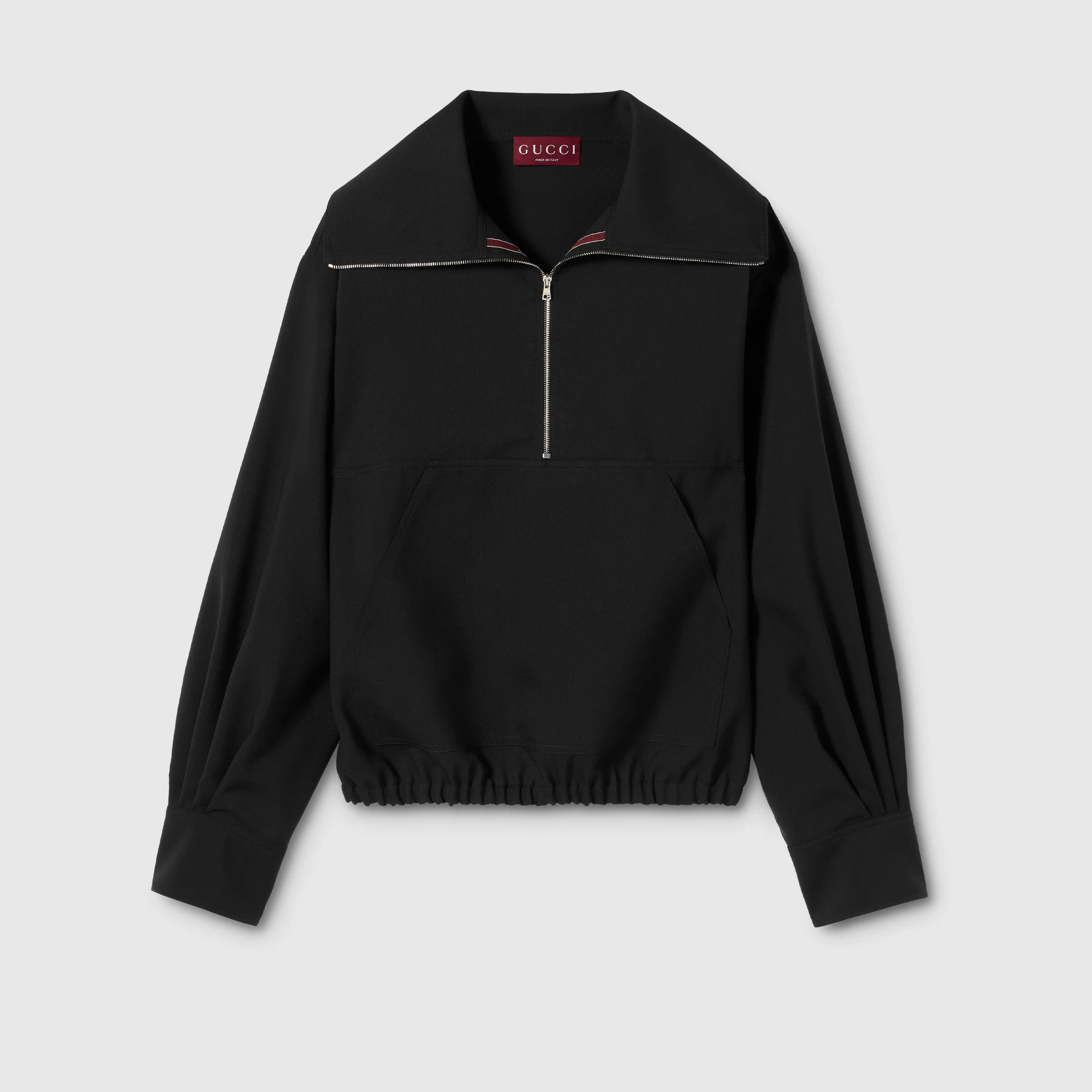 The Cruise 2026 women's ready-to-wear collection celebrates the Gucci wardrobe, blending archival influence with the history of Florence in a playful melange, ranging from the minimal to the maximal. Crafted from wool, this sweater is defined by a Gucci selvedge detail. - Dark blue wool - Gucci selvedge detail - Half lining - Gathered waist - Kangaroo pocket - Long sleeves - Zip closure - Length: 25.6" based on a size S - Fabric: 100% Wool - Lining: 100% Viscose