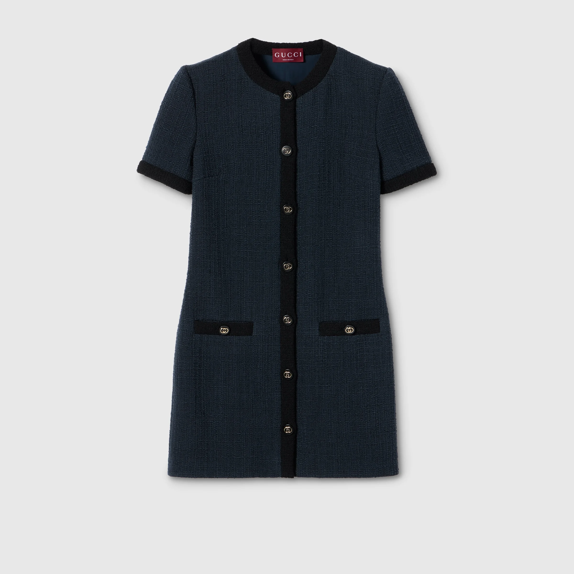 The Cruise 2026 women's ready-to-wear collection celebrates the Gucci wardrobe, blending archival influence with the history of Florence in a playful melange, ranging from the minimal to the maximal. Crafted from wool textured tweed, this dress is finished with Interlocking G buttons. - Blue wool textured tweed - Interlocking G button - Lined - Crewneck - Front pockets - Short sleeves - Length: 32.2" based on a size 40 (IT) - Fabric: 95% Wool, 5% Polyamide - Details: 95% Wool, 5% Polyamide - Lining: 75% Acetate, 25% Silk