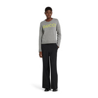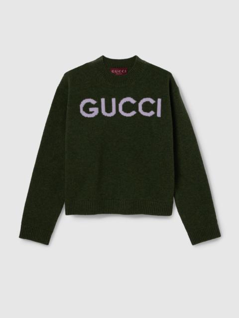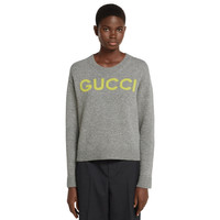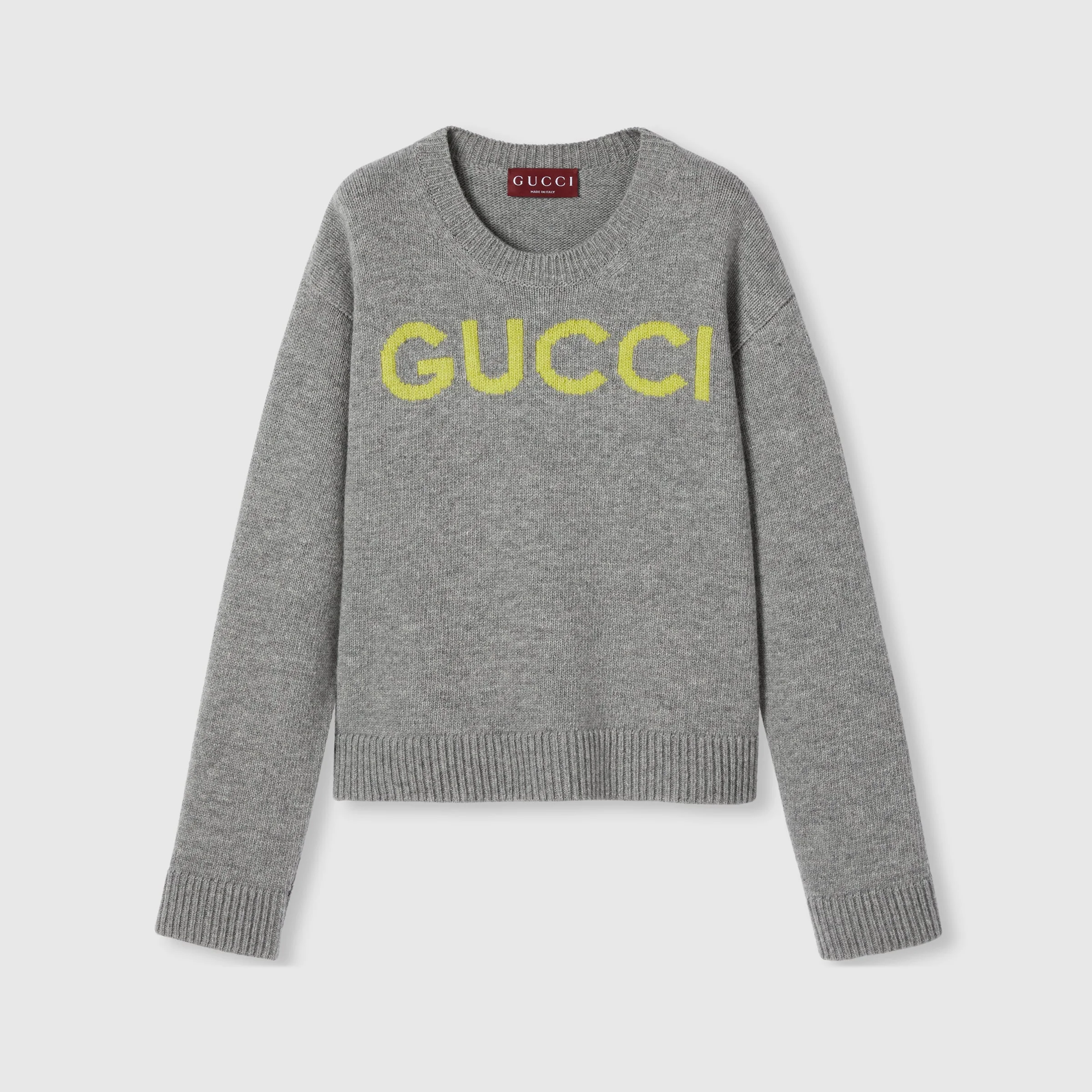 The Gucci logo appears in unexpected colors and fabric combinations, from linen blend to wool. This crewneck top is presented in a grey wool and enriched with a 'Gucci' intarsia. - Grey wool - Gucci intarsia - Crewneck - Dropped shoulder - Long sleeves - Rib trim - Shoulder drop: 18.5 " based on a size S (IT) - Sleeves Length: 21.2 " based on a size S (IT) - Regular fit - Length: 21.6 " based on a size S (IT) - Made in Italy - Hem Width: 48cm, based on a size S