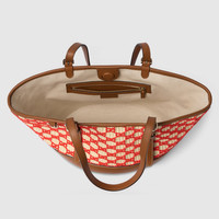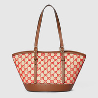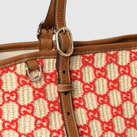This tote showcases intricate craftsmanship inspired by traditional weaving technique. The velvet GG motif is created with a loop stitch process, resulting in a soft yet visually rich embroidery. The bag is complete with leather trim and hardware details in light gold-toned finish. - Natural and red woven straw-effect fabric - Brown leather trim - Light gold-toned hardware - Brown cotton linen lining - Inside: 1 zip pocket - Adjustable leather handle drop: 10.2"-14.2"; Length: 35.8" - Magnetic closure - 9.4"W x 7.9"H x 6.7"D - Weight: 1.3lbs approximately - Fits an iPad, iPhone, Airpods, and small items