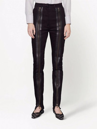 Imbued with references from Gucci's glamour-infused Tom Ford era, Aria redefines the idea of femininity with hints to the concept of freedom that fashion experienced in the '90s. Recurring details throughout the collection are oversized zip, both functional and decorative, like this pant decorated with zip details down the leg. - Black stretch cotton - Leather zip patch pockets - Elastic band detail at the feet - Zip detail - Button and zip closure - Lenght: 44", based on a size 25 (IT) - Leg opening: 5.5", based on a size 25 (IT) - Made in Italy - The model is 5'8" tall. The product shown in this image is a size 25 (IT)