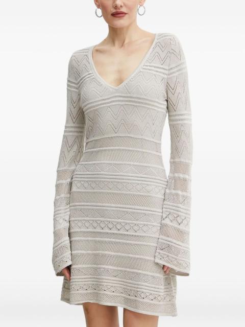 bell-sleeve knitted mini dress Highlights - Light beige - V-neck - Bell sleeves Imported Composition Viscose 70%, Polyester 19%, Metallised Fibres 11% Washing instructions Read Manufacturer Guidelines