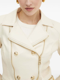 belted double-breasted jacket Highlights - Beige - Textured panels - Double-breasted - Button fastening - Zip details - Belted Imported Composition Outer: Polyurethane 100%, Rayon 96%, Elastane 4% Lining: Polyester 95%, Elastane 5% Washing instructions Read Manufacturer Guidelines