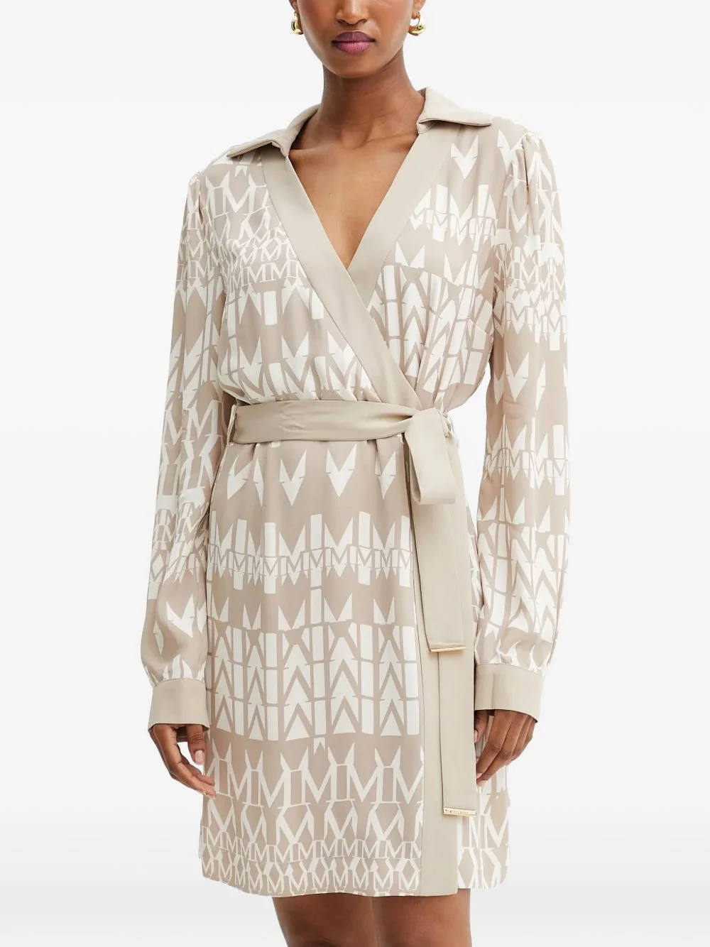 belted geometric-pattern mini dress Highlights - Beige - Geometric pattern - Wrap design - V-neck - Long sleeves - Belt Imported Composition Viscose 100%, Polyester 100% Washing instructions Read Manufacturer Guidelines