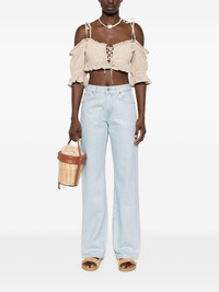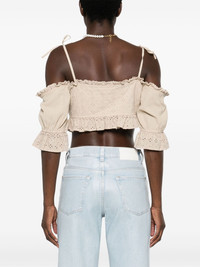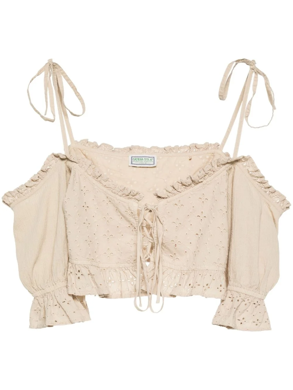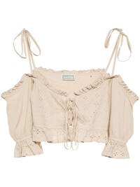 broderie-anglaise crop top Highlights - Sand beige - Cotton - Broderie anglaise - Ruffled trim - Adjustable spaghetti straps - Off-shoulder - Short sleeves - Crossover strap detail - Ruffle hem - Cropped - Self-tie fastening Imported Composition Lining: Cotton 100% Outer: Cotton 100% SIZE & FIT Model measurements Height 5 ft 10 in(1.77 m) Bust/Chest 32.28 in(82 cm) Hips 35.03 in(89 cm) Waist 25.19 in(64 cm) FittingInformation Designed for a slim fit that sits just away from the body offering a close yet comfortable fit The adjustable shoulder straps allow for a preferred fit when worn Made from a midweight non-stretch fabric This piece fits true to size – take your usual size