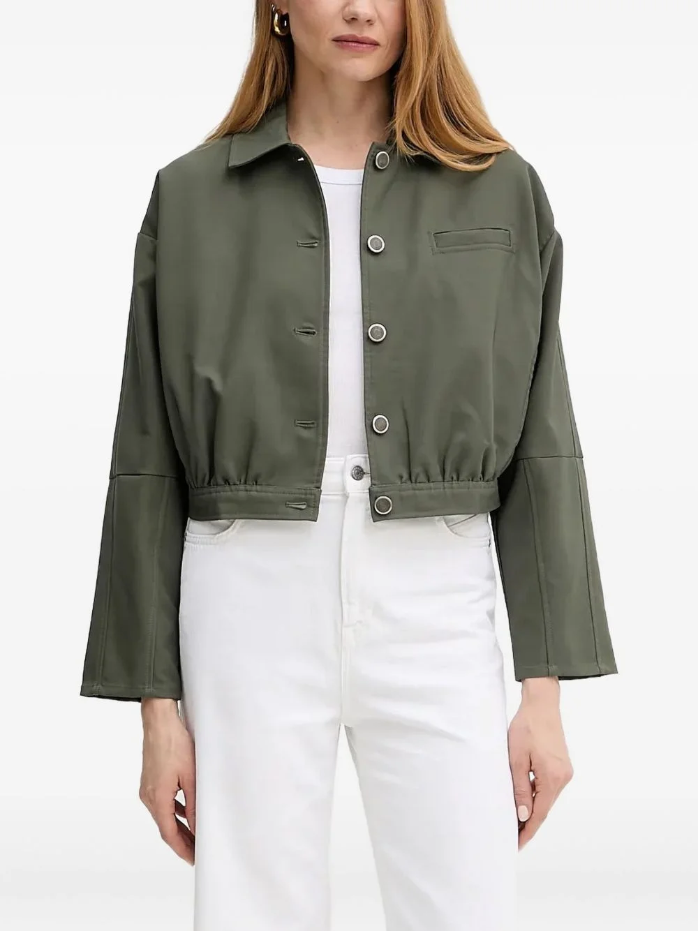 button-fastening cinched jacket Highlights - Olive green - Classic collar - Button front fastening - Chest jetted pocket - Cinched hem - Long sleeves Imported Composition Polyester 100% Washing instructions Read Manufacturer Guidelines