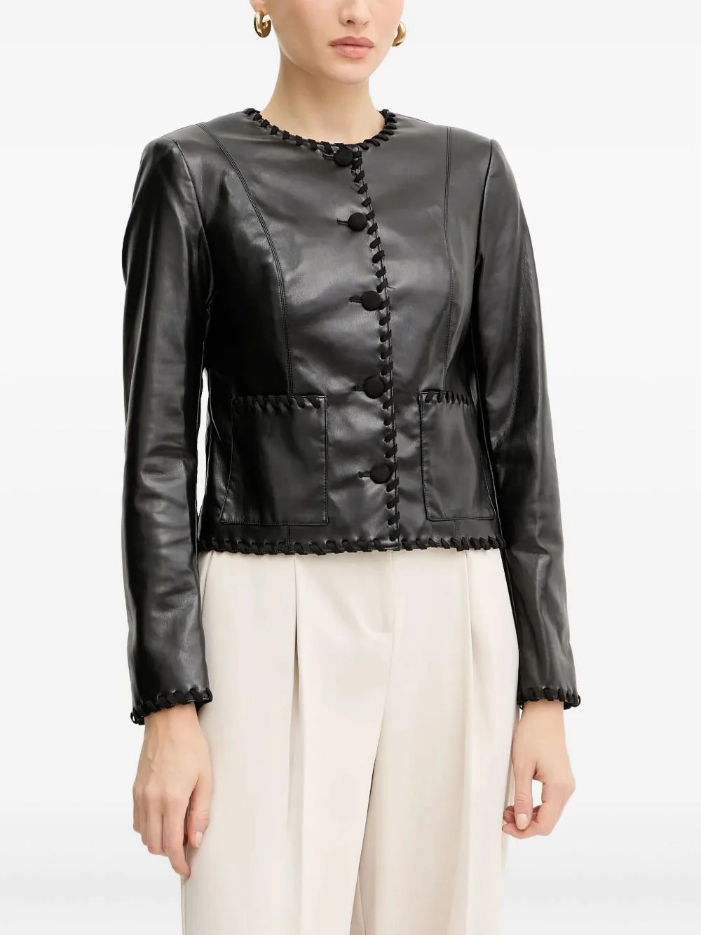 button jacket Highlights - Black - Button fastening - Trim detail - Round neck - Front pockets - Long sleeves Imported Composition Polyurethane 100% Washing instructions Read Manufacturer Guidelines