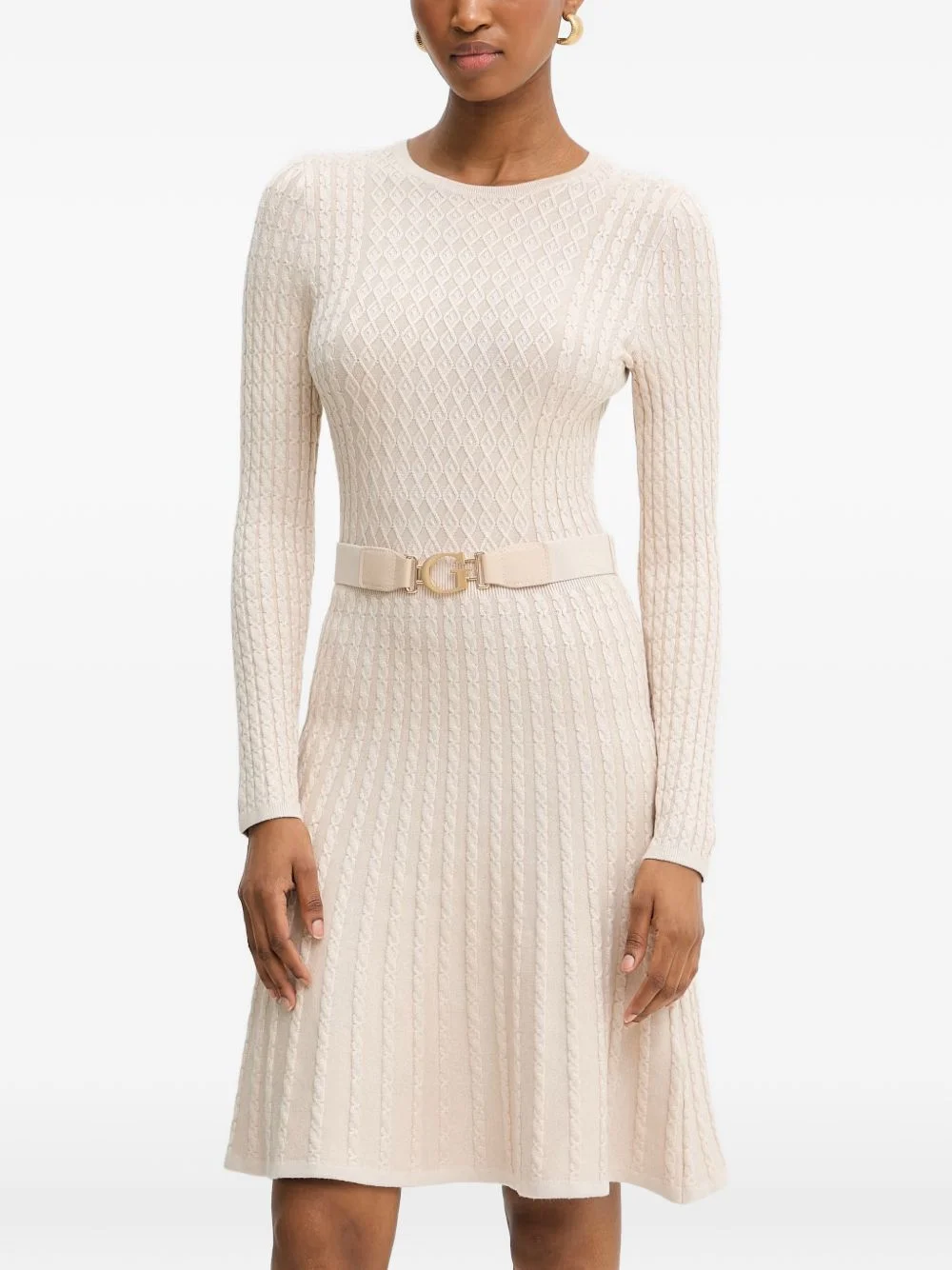 cable-knit belted mini dress Highlights - Beige - Cable knit - Belt detail - Round neck - Long sleeves Imported Composition Viscose 89%, Polyamide 10%, Elastane 1% Washing instructions Read Manufacturer Guidelines