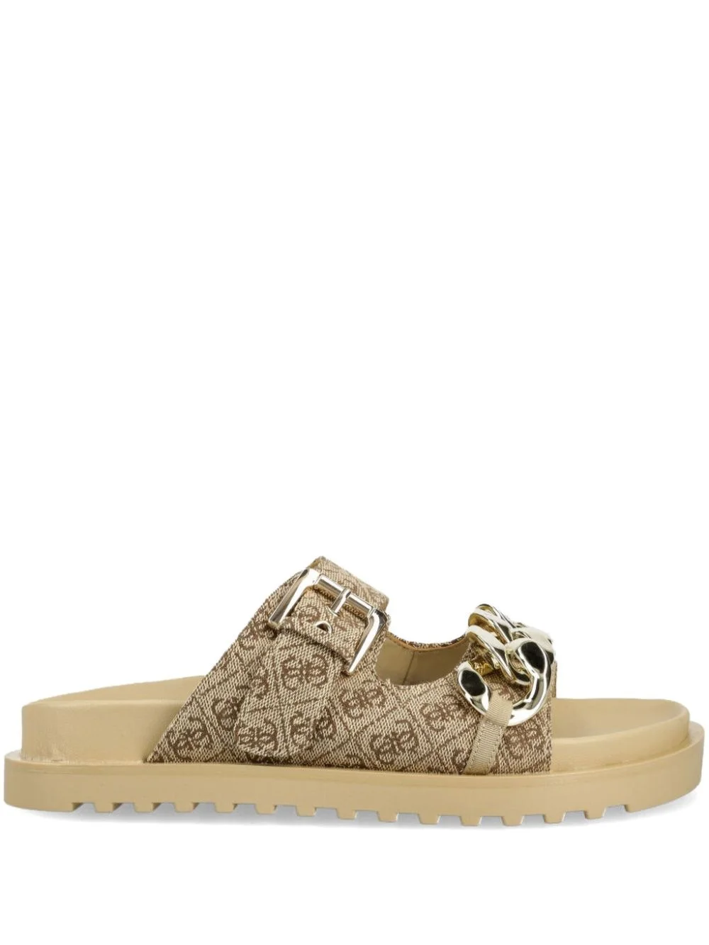 chain link-detail sandals Highlights - Light beige - Buckle-strap fastening - Double-strap design - Asymmetric toe - Rubber sole Imported Composition Outer: Polyester 100% Sole: Rubber 100%