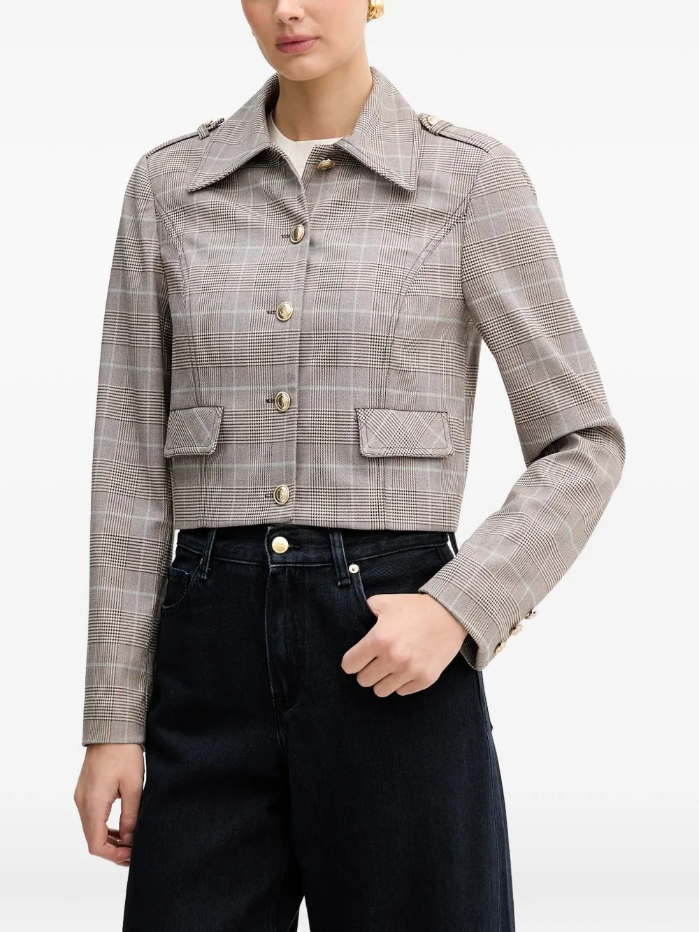 check button cropped jacket Highlights - Beige - Check pattern - Button fastening - Flap pockets - Long sleeves - Shoulder detail Imported Composition Outer: Recycled Polyester 68%, Viscose 30%, Elastane 2% Lining: Recycled Polyester 97%, Elastane 3% Washing instructions Hand Wash
