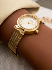 crystal-embellished 33mm Highlights - Stainless steel case - Analog movement - White - Geometric dial - Baton hands - Engraved logo - Crystal embellishment - Crystal-encrusted bezel - Round face - Screw-down crown - Mesh bracelet - Clasp fastening - Water resistance up to 30m/3 atm - This item comes with a standard two-year warranty from the brand. Imported SIZE & FIT Measurement DIAMETER 1.18 in(3 cm)