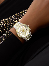 crystal-embellished quartz 36mm Highlights - 36mm - Silver/gold-tone - Recycled steel - Round face - Geometric dial - Baton hands - Chronograph counters - Crystal embellished - Quartz movement - Chronograph pushers - Screw-down crown - Adjustable link bracelet - This item comes with a standard one-year warranty from the boutique. Imported SIZE & FIT Measurement DIAMETER 1.41 in(3.6 cm)