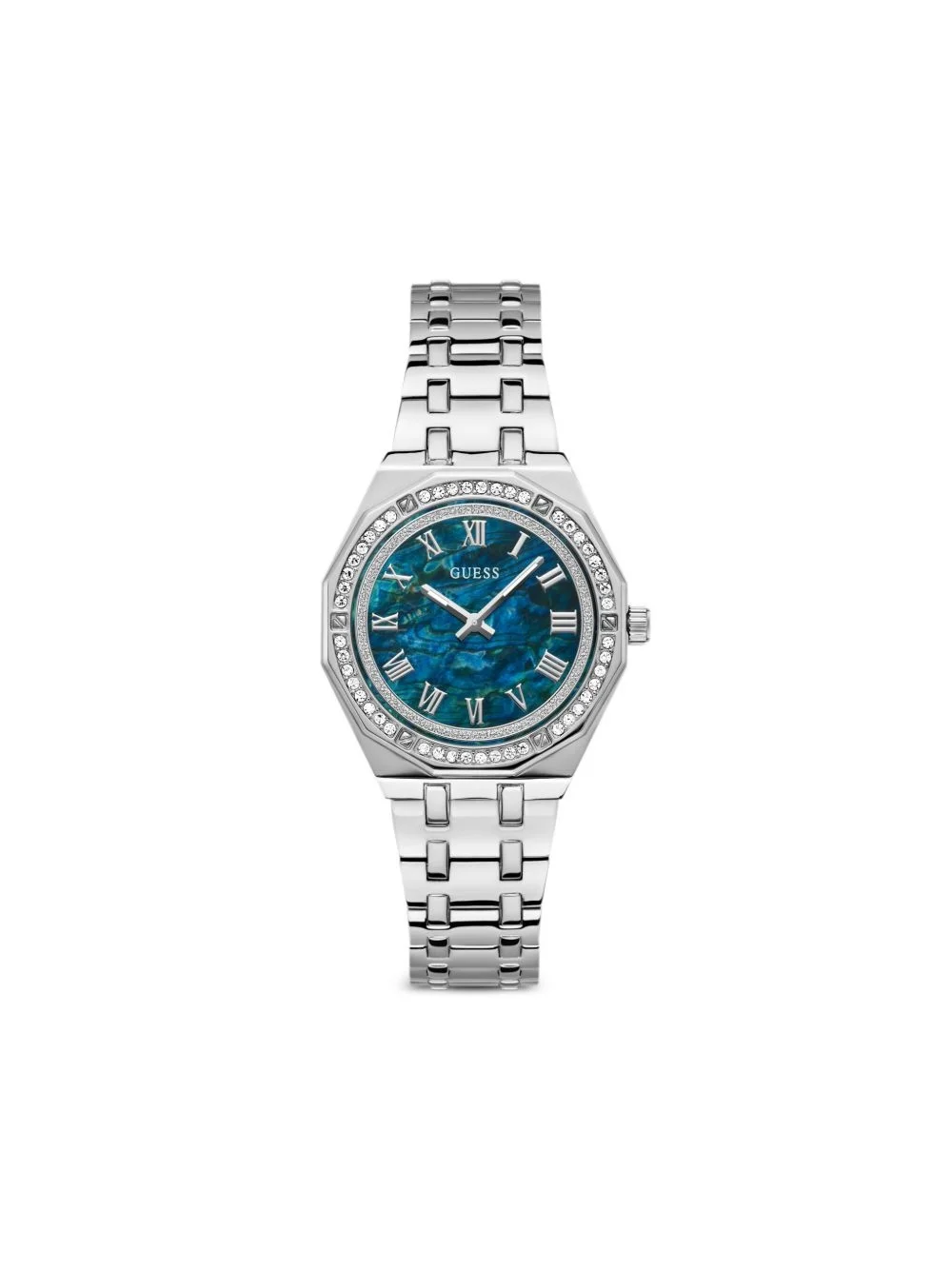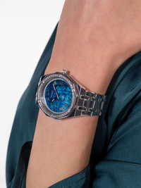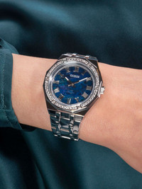 Desire 36mm Highlights - 36mm - Blue - Stainless steel - Roman numeral dial - Stick hands - Round face - Mineral glass - Crystal-encrusted bezel - Centre-dent crown - Adjustable link bracelet - Folding clasp Imported SIZE & FIT Measurement DIAMETER 1.41 in(3.6 cm) WIDTH 0.78 in(2 cm)