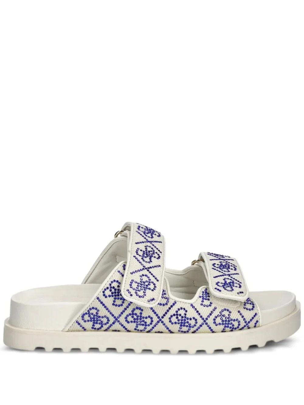 Fadeliza double-strap flat sandals Highlights - Cream - Geometric crystal design - Adjustable straps - Flat sole - Textured outsole Imported Composition Outer: Polyester 88%, Polyurethane 12% Lining: Fabric 100% Sole: Rubber 100%