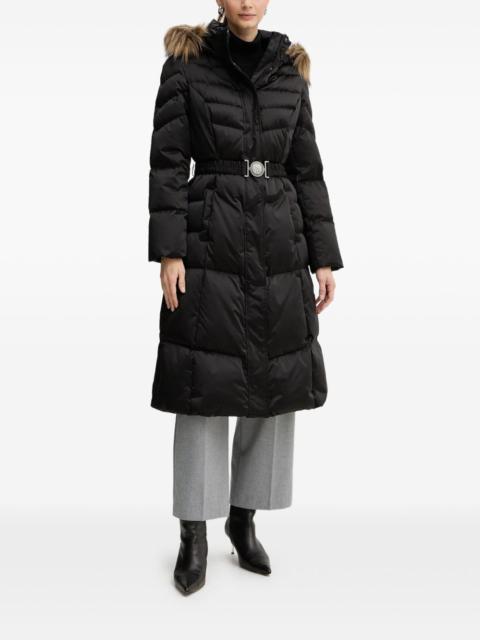 hooded padded coat Highlights - Brown - Quilted construction - Faux-fur trim hood - Buckle belt - Long sleeves Imported Composition Outer: Polyester 100% Filling: Duck Down 100% Lining: Polyester 100% Washing instructions Machine Wash