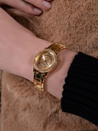 Melody 28mm Highlights - 28mm - Stainless steel - Digital–analogue display - Battery-operated movement - Arabic dial - Gold-tone - Baton hands - Crystal-encrusted bezel - Screw-down crown - Adjustable link bracelet - Folding clasp - Water resistance up to 30m/3 atm - Additional strap included. - This item comes with a standard two-year warranty from the brand. Imported