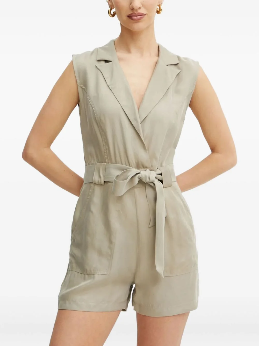 notched-collar belted playsuit Highlights - Light beige - Collared neckline - Sleeveless design - Self-tie belt - Front pockets Imported Composition Cupro 58%, Viscose 42% Washing instructions Hand Wash