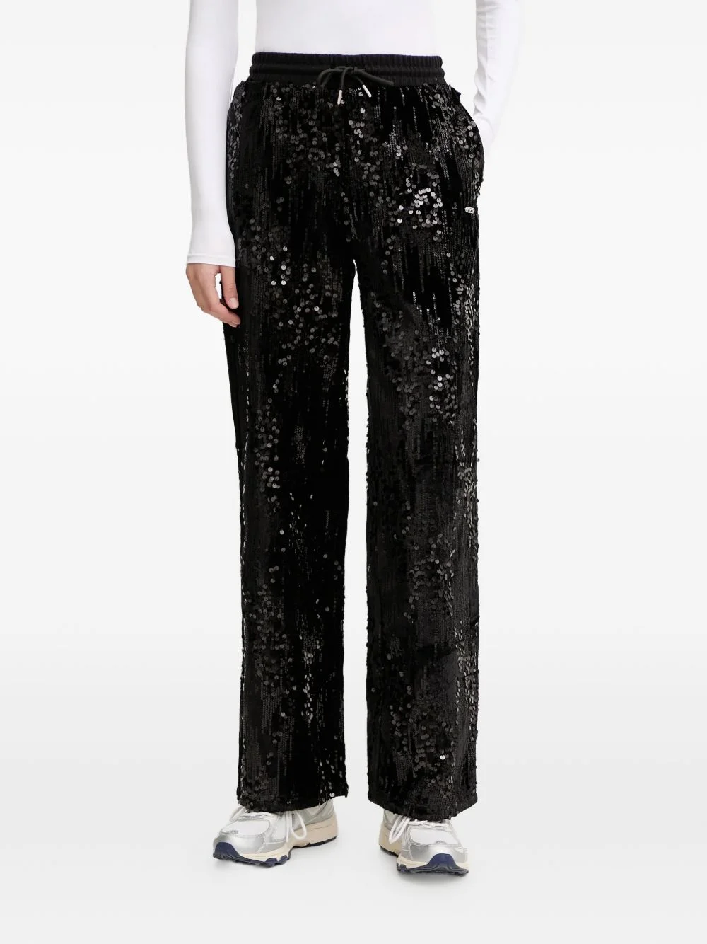 sequin-embellished trousers Highlights - Black - All-over sequin embellishment - Drawstring fastening - Elasticated waistband Imported Composition Fabric 100% Washing instructions Read Manufacturer Guidelines