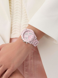 Sparkling Pink Limited Edition 38mm Highlights - 38mm - Pink - Stainless steel - Round face - Crystal dial - Baton hands - Chronograph counters - Date indication - Quartz movement - Chronograph pushers - Screw-down crown - Logo pattern - Adjustable link bracelet - This is a limited edition piece. - This item comes with a standard one-year warranty from the boutique. Imported SIZE & FIT Measurement DIAMETER 1.49 in(3.8 cm)