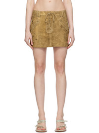 Lambskin suede skirt. Hand-fading, distressing, and graphic pattern printed throughout. · Belt loops · Two-pocket styling · Exposed lace-up fly · Eyelets and lace-up detailing at back Supplier color: Grayson tan multi 100% lambskin. Made in Turkey 241603F090000