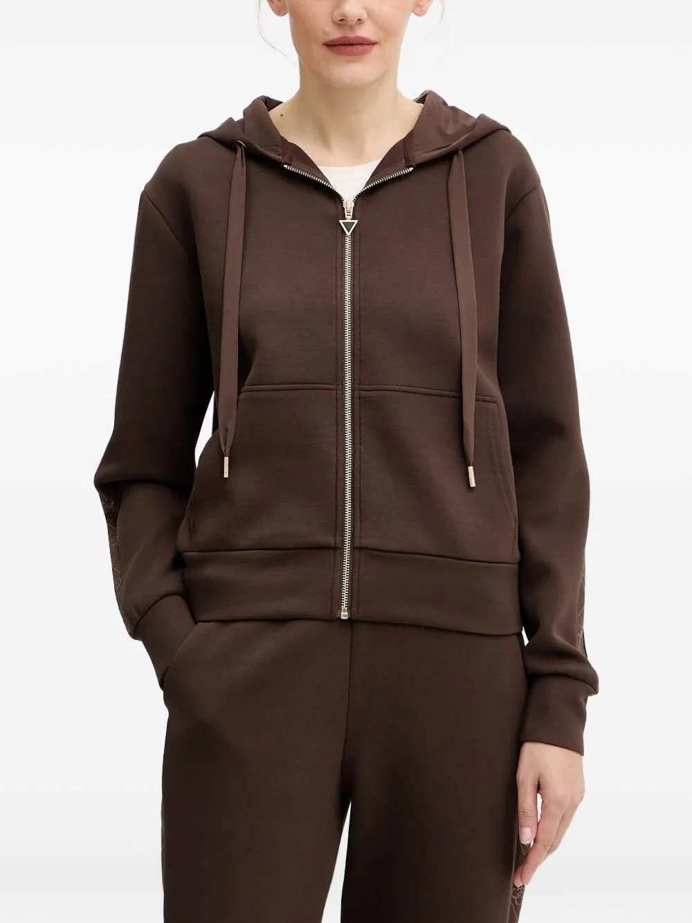 zipped embellished hoodie Highlights - Brown - Embellished detailing - Zip fastening - Drawstring hood - Long sleeves - Front pouch pocket Imported Composition Outer: Recycled Polyester 48%, Recycled Viscose 42%, Recycled Elastane 10% Lining: Polyester 100% Washing instructions Read Manufacturer Guidelines