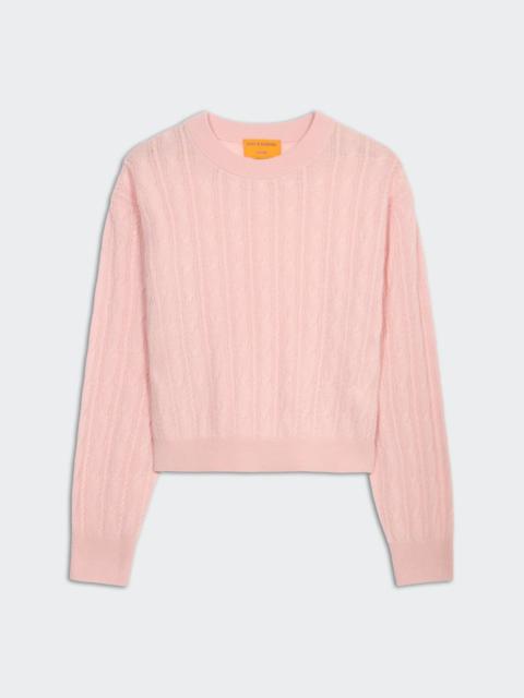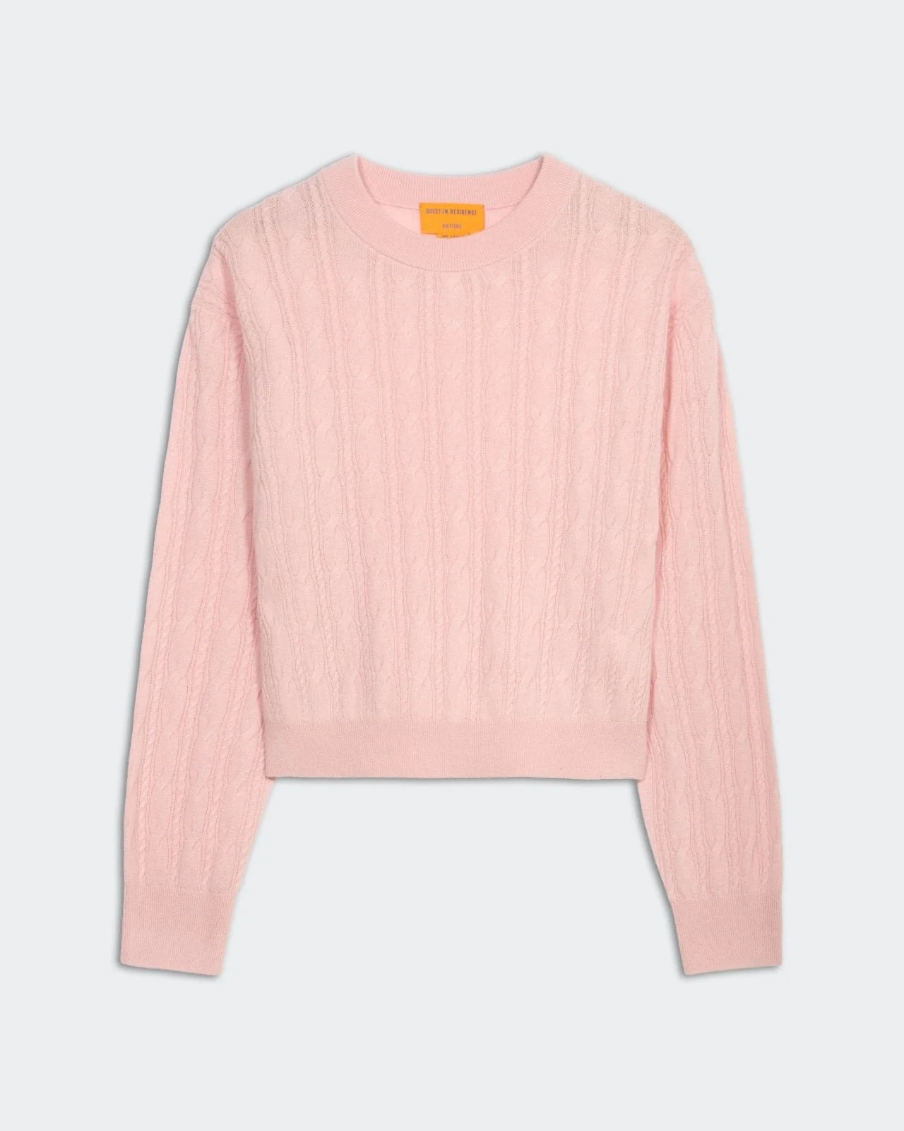 - LIGHT WEIGHT CABLE CREW - RIB CUFF, HEM AND NECK TRIM - Signature GIR branding at center back - 100% CASHMERE - ELLA IS 5' 11" / 180 CM and is wearing a Small. - Premium cashmere sourced from inner Mongolia, manufactured in China