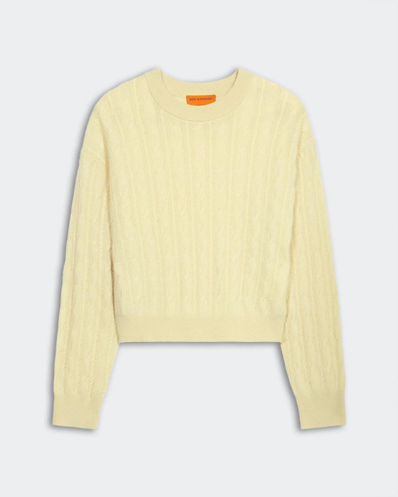 - LIGHT WEIGHT CABLE CREW - RIB CUFF, HEM AND NECK TRIM - Signature GIR branding at center back - 100% CASHMERE - FLOOR IS 5' 10" / 178 CM and is wearing a Small. - Premium cashmere sourced from inner Mongolia, manufactured in China