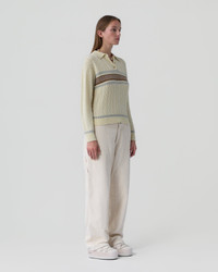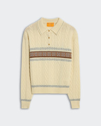 A fresh take on the classic cashmere polo, the Cable Collegiate Polo features a cable body stitch with Fair Isle snowflake patterning. Made from a wool–cashmere blend, this women’s winter polo sweater combines timeless craftsmanship with a touch of festive charm. DETAILS - MID-WEIGHT CABLE FAIRISLE POLO - CABLE BODY STITCH WITH FAIRISLE ACROSS CHEST - SNOWFLAKE PATTERN - FAIRISLE DETAIL ABOVE SLEEVE CUFF AND HEM - RIB POLO COLLAR WITH THREE BUTTON PLACKET CLOSURE - SIGNATURE GIR BRANDING AT BACK NECK - 70% WOOL, 30% CASHMERE - JAMILLA IS 5’ 11” / 180 CM AND IS WEARING A SIZE SMALL.