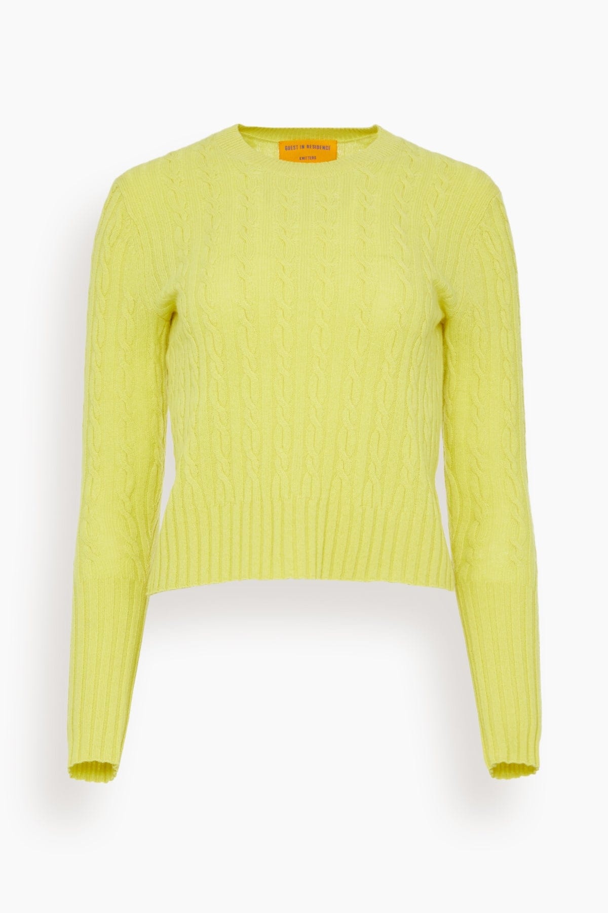 The Guest In Residence Cable Shrunken Crew in Lemon is a cable knit cashmere sweater with slim fit and ribbed hem and cuffs. - High rib sleeve cuff - Rib hem and neck trim - Signature GIR branding at center back - Lightweight knit - 100% Cashmere - Premium cashmere sourced from inner Mongolia