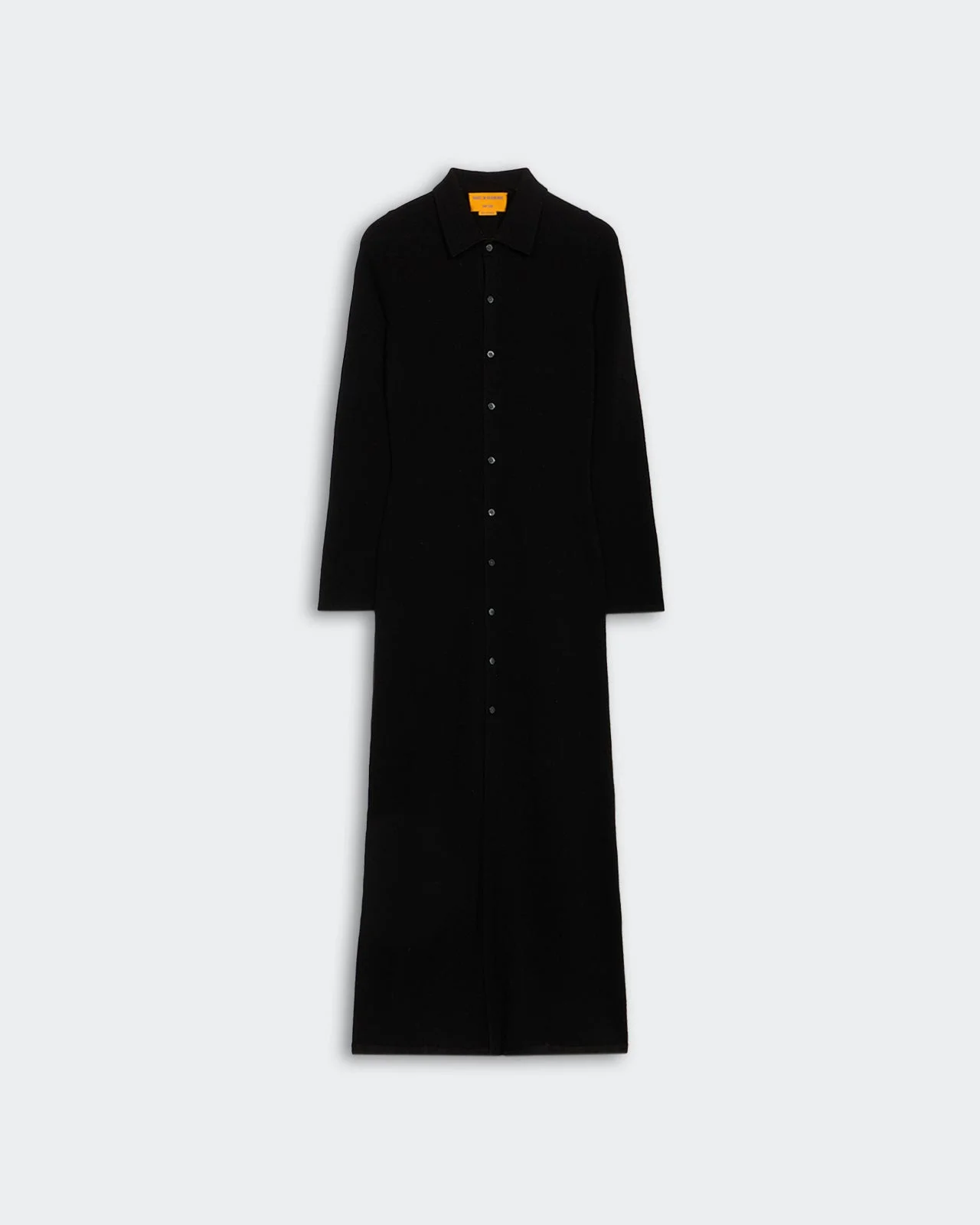 - LIGHT-WEIGHT JERSEY SHIRT DRESS - LONG DRESS FIT AS SHOWTIME SHIRT DRESS - SHIRT COLLAR WITH STAND AND FRONT BUTTON UP CLOSURE - Signature GIR branding at center back neck - 100% CASHMERE - ELLA IS 5' 11" / 180 CM and is wearing a small. - Premium cashmere sourced from inner Mongolia, manufactured in China