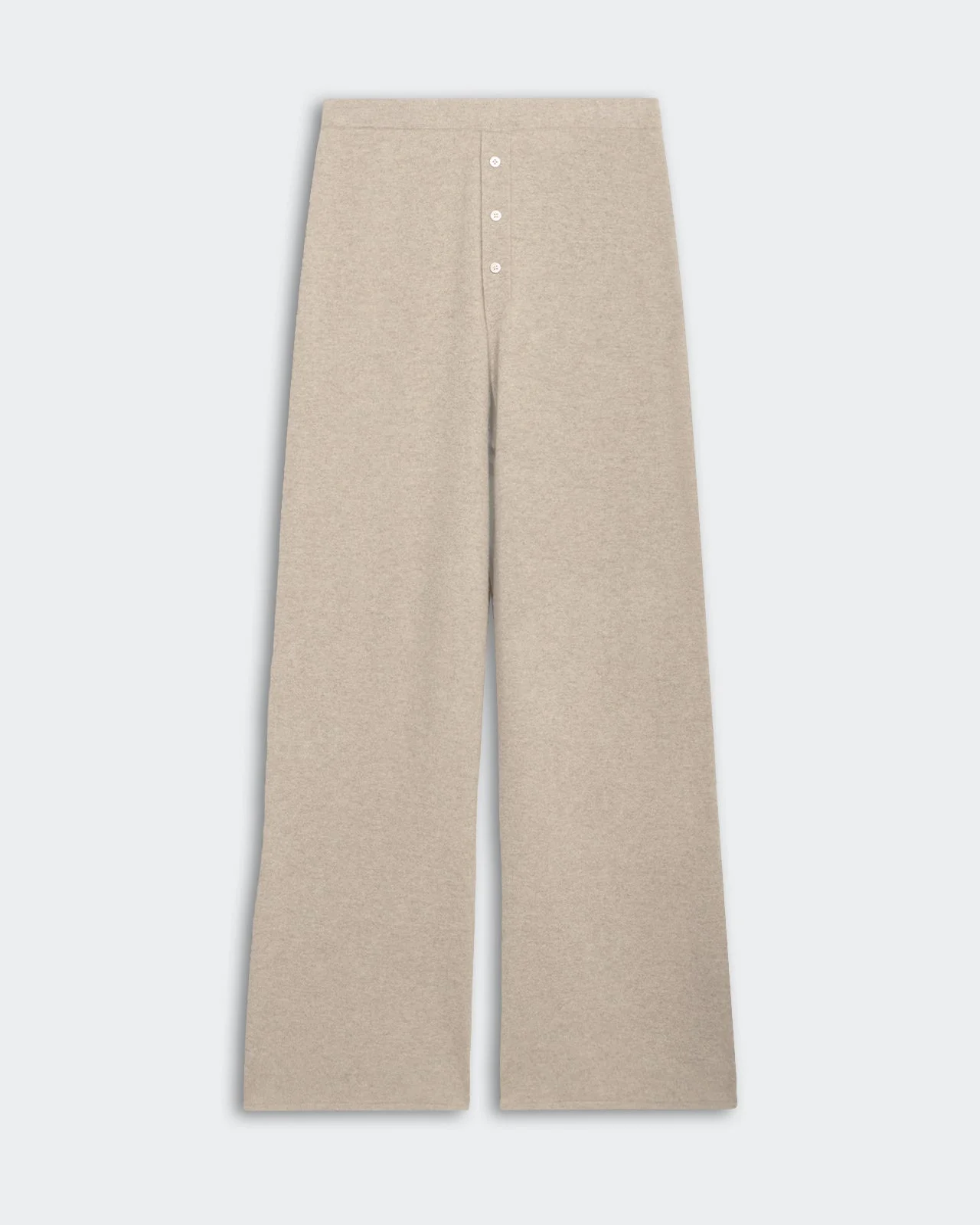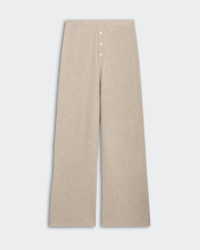 - Women's sizing, intended for a relaxed fit. - Navy color - Straight leg - Elastic waistband - Front three-button placket faux closure - 100% Cashmere - Light-weight knit - FLOOR IS 5' 10" / 178 CM and is wearing a Small. - Premium cashmere sourced from inner Mongolia, manufactured in China