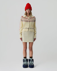 The Cloud Chalet Cardigan is a women’s Fair Isle cashmere cardigan crafted from a wool–cashmere blend and plush Cloud yarn. Designed with a relaxed, shrunken fit, it offers cozy warmth and timeless pattern — perfect for layering through the colder months. DETAILS - HEAVY-WEIGHT FAIRISLE YOKE CARDIGAN - CURVED YOKE FAIRISLE RAGLAN CARIGAN - FRONT BUTTON CLOSURE - RIB POLO COLLAR - RELAXED, SHRUNKEN FIT - RIB HEM AND CUFF - SIGNATURE GIR BRANDING DETAIL AT BACK NECK - 70% WOOL, 30% CASHMERE + "CLOUD" 90% MERINO WOOL, 10% NYLON YARN COMBO - CHIMENE IS 5' 9'' / 175.26 CM AND IS WEARING A SIZE SMALL.