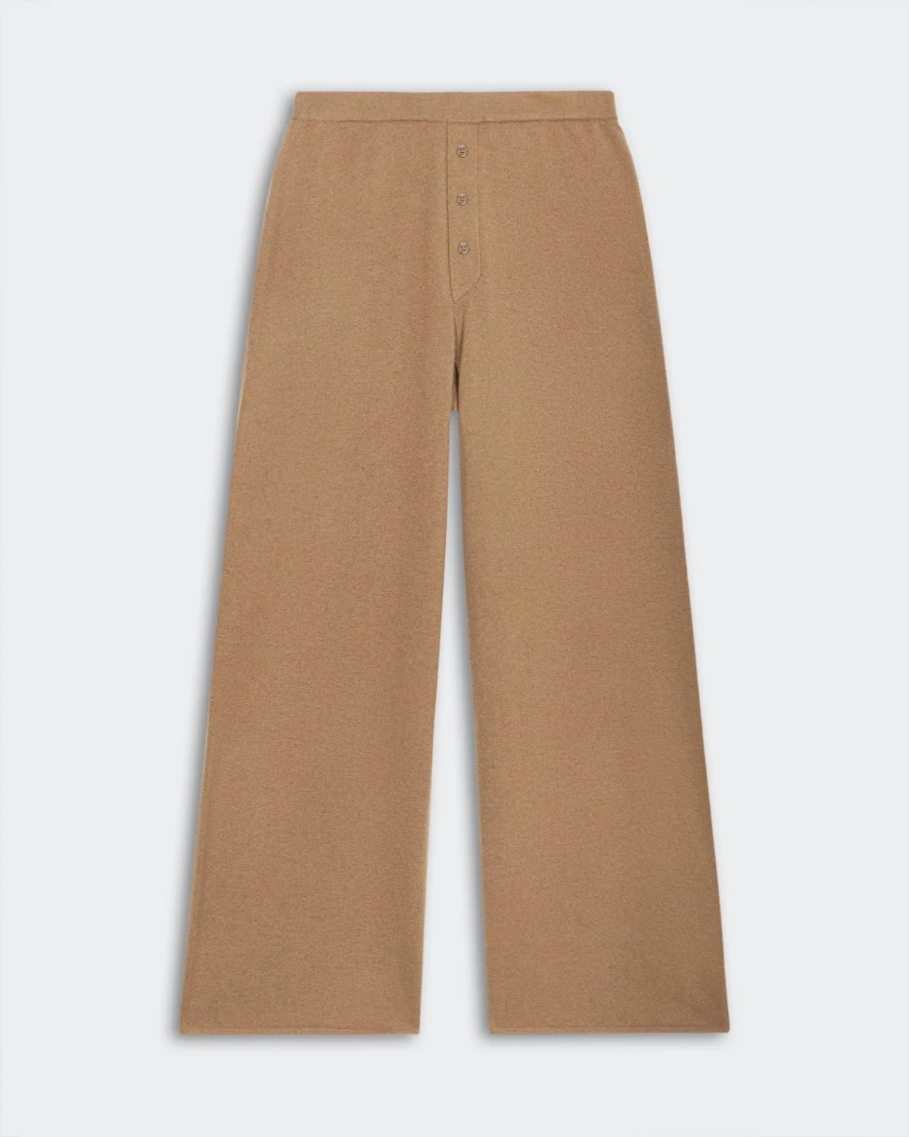 - Women's sizing, intended for a relaxed fit. - Light-weight knit - Straight leg - Elastic waistband - Front three-button placket faux closure - 100% Cashmere - Julia is 5' 9.5" / 177cm and is wearing a small. - Premium cashmere sourced from inner Mongolia, manufactured in China