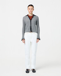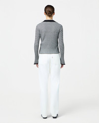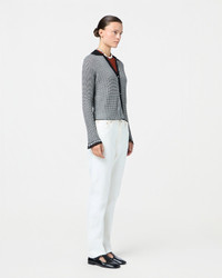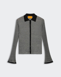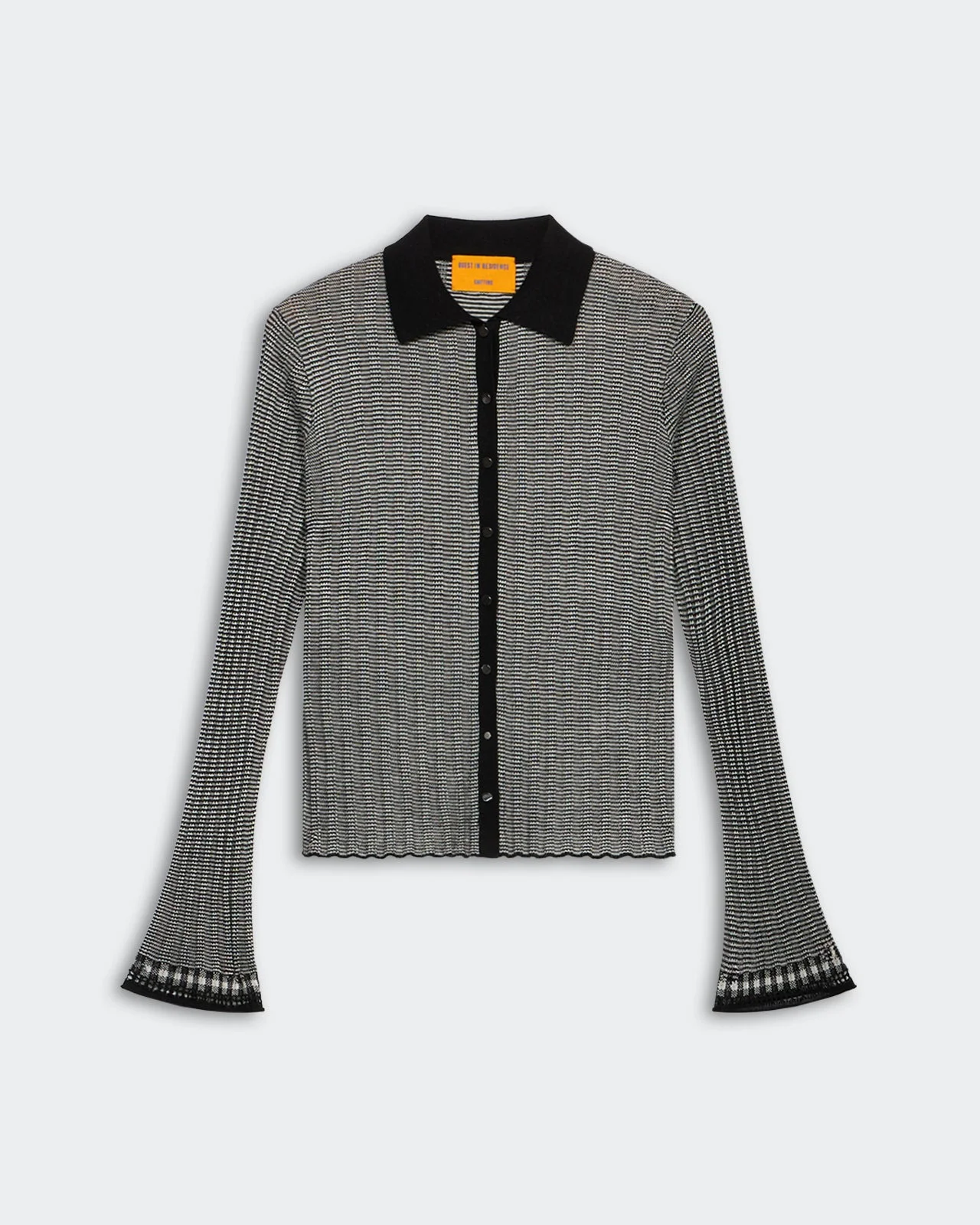 - FINE WEIGHT RIB STRIPED SHIRT - SOLID COLOR FRONT BUTTON CLOSURE WITH MOP SHELL BUTTONS - RIB POLO COLLAR IN SOLID COLOR - SPECIAL LACE GINGHAM STITCH DETAIL AT SLEEVE & HEM - Signature GIR branding at center back - 70% SILK 30% LINEN BLEND - ELLA IS 5' 11" / 180 CM is wearing a small.
