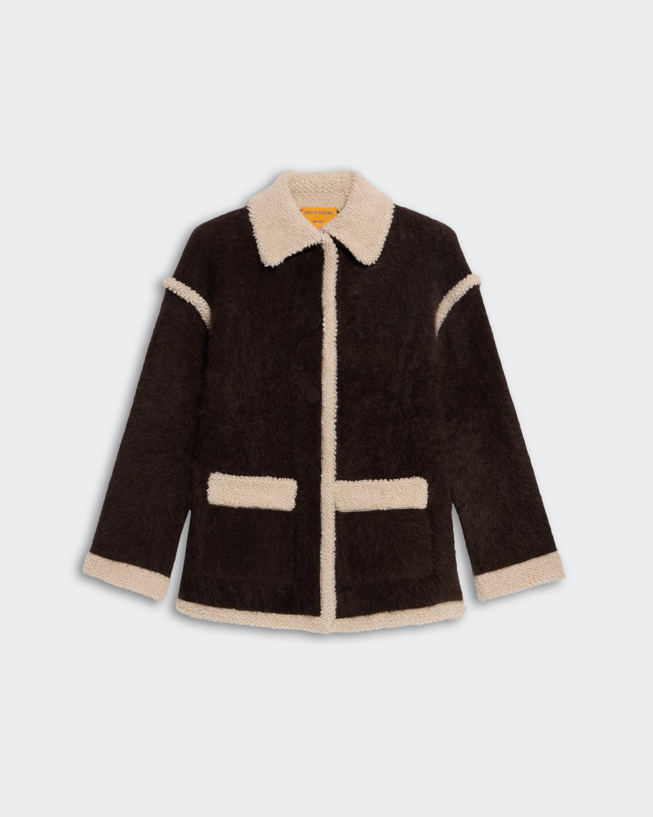 - Brushed cashmere jacket - shearling style jacket - Mid-weight knit - Grizzly-brushed effect - Front closure with fabric covered buttons - Contrasting knitted shearling collar, cuffs, hem, and pocket detail - Two front patch pockets - Contrast knitted shearling at the shoulder seam - Signature gir branding at center back - Julia is 5' 9.5" / 177cm and is wearing a small. - 100% cashmere - Premium cashmere sourced from inner Mongolia, manufactured in China