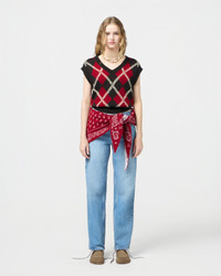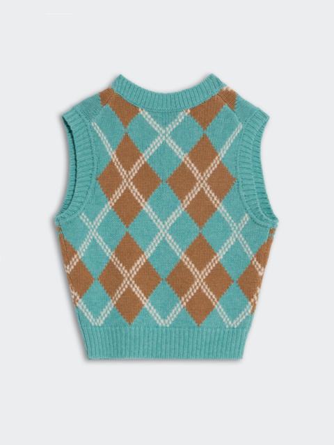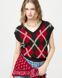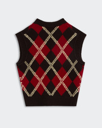 - Argyle vest - Heavy-weight - Rib hem, neck and armhole trim - V-neck - Signature gir branding at center back - Contrast fuzzy cloud yarn WITH diagonal stripe pattern - 3 Gauge - 70% wool 30% cashmere - FLOOR IS 5' 10" / 178 CM and is wearing a small.